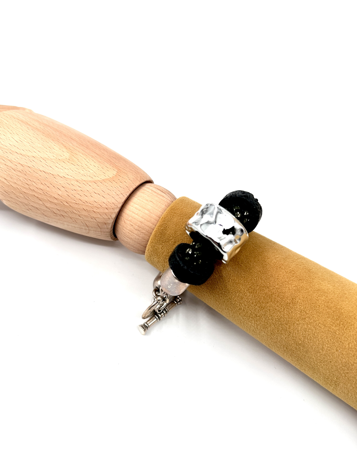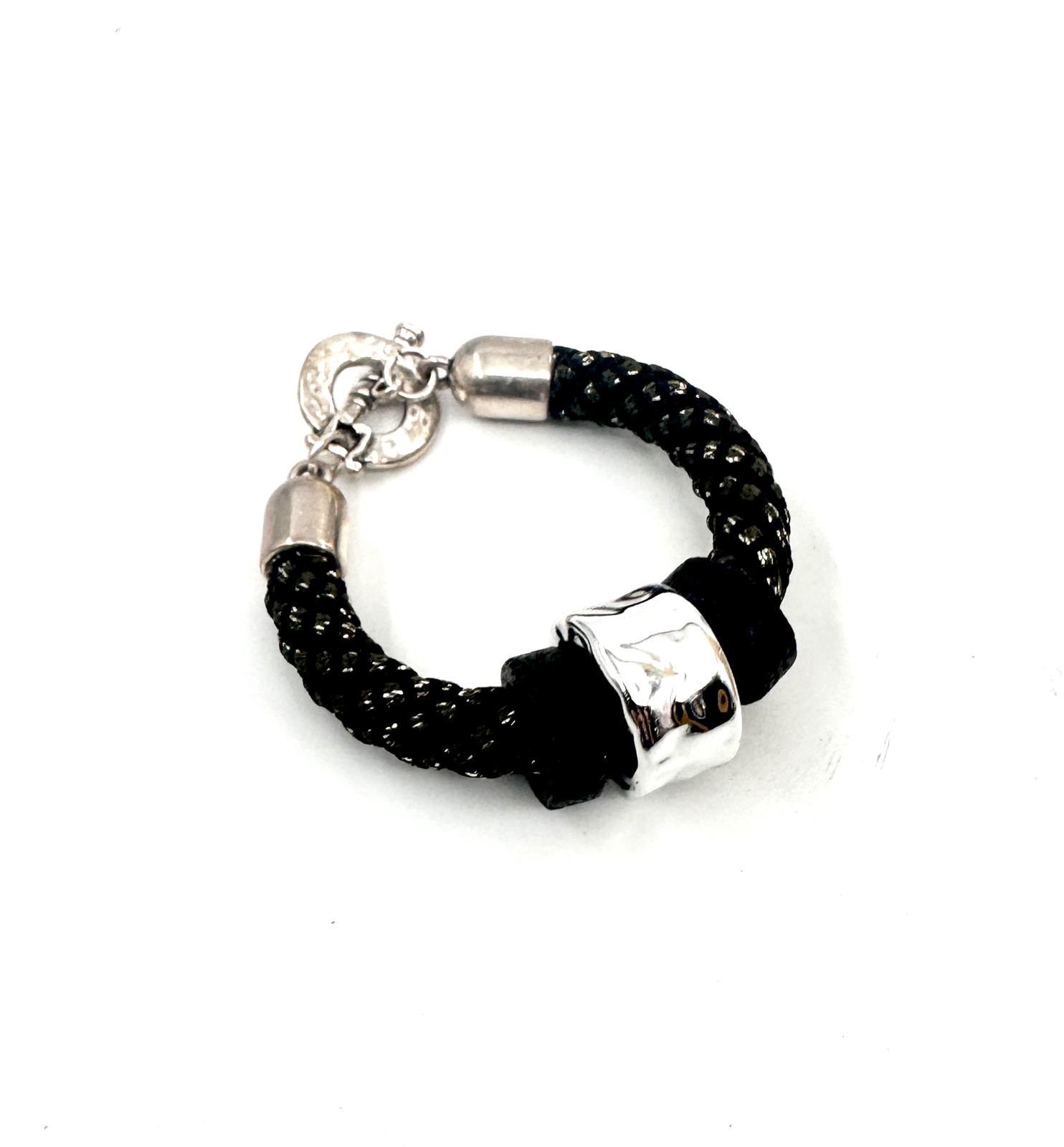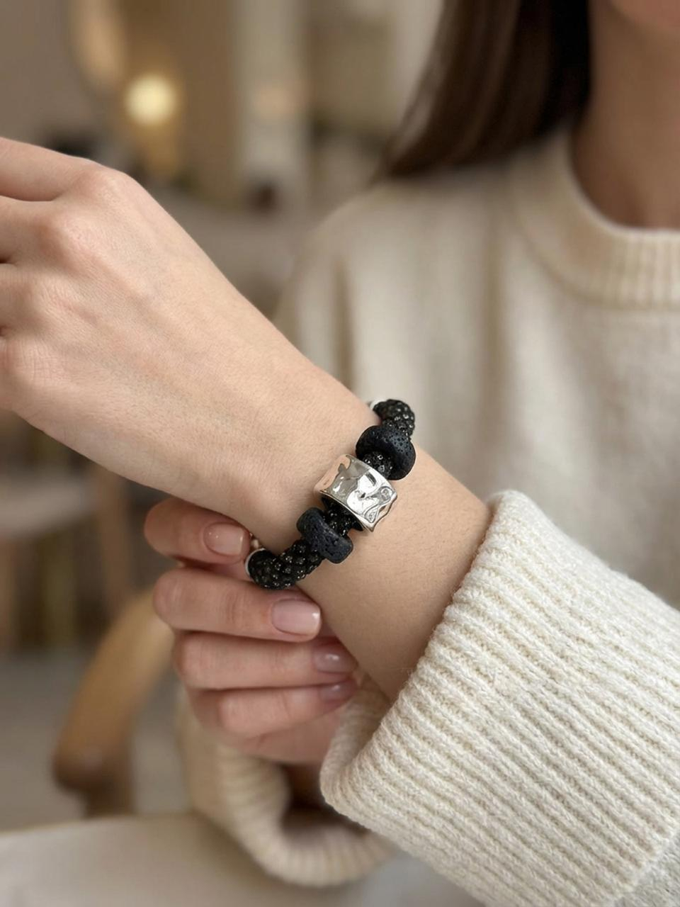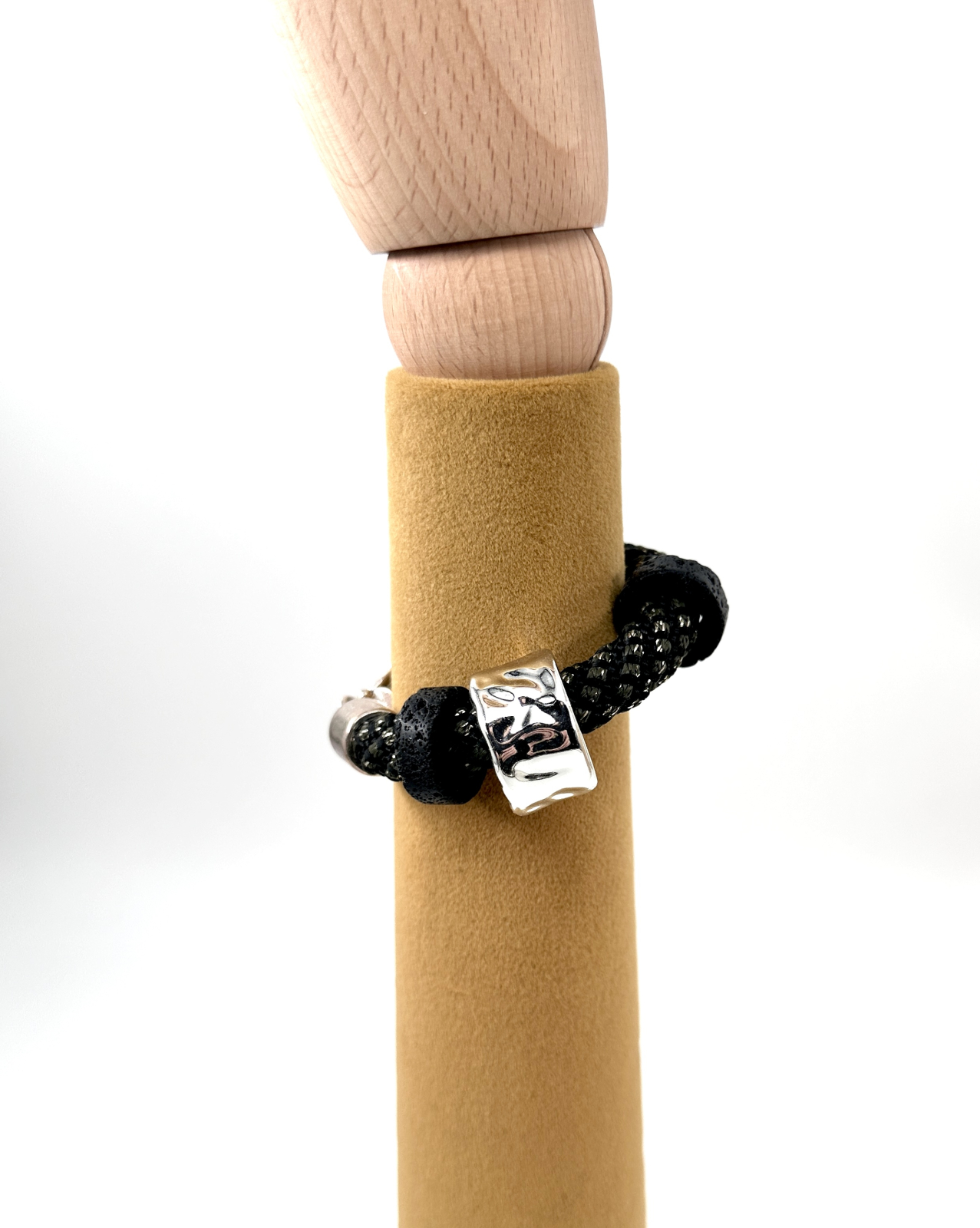 Această brățară redefinște eleganța contemporană printr-un dialog fascinant al texturilor. Piesa centrală este construită în jurul contrastului tactil dintre rugozitatea poroasă a pietrei de lavă vulcanică și suprafața fluidă, aproape lichidă, a elementului metalic central. Designul se distinge printr-o împletitură textilă densă, cu inserții metalice discrete, care oferă o structură robustă, dar surprinzător de confortabilă la contactul cu pielea.