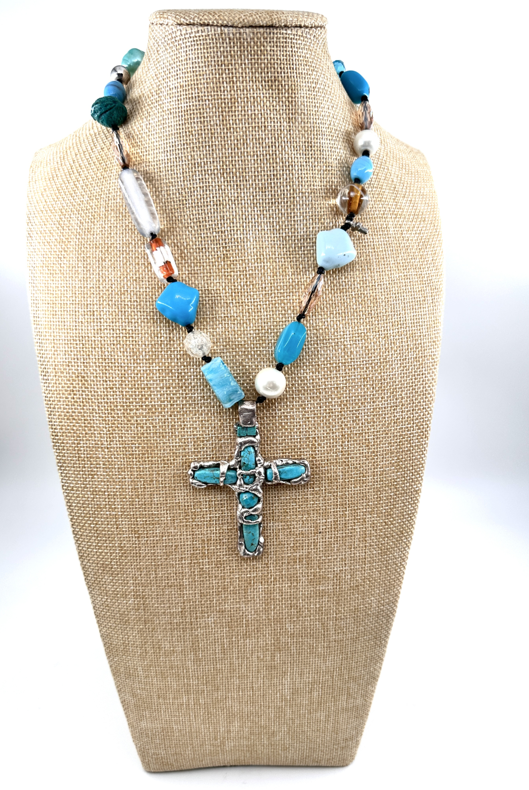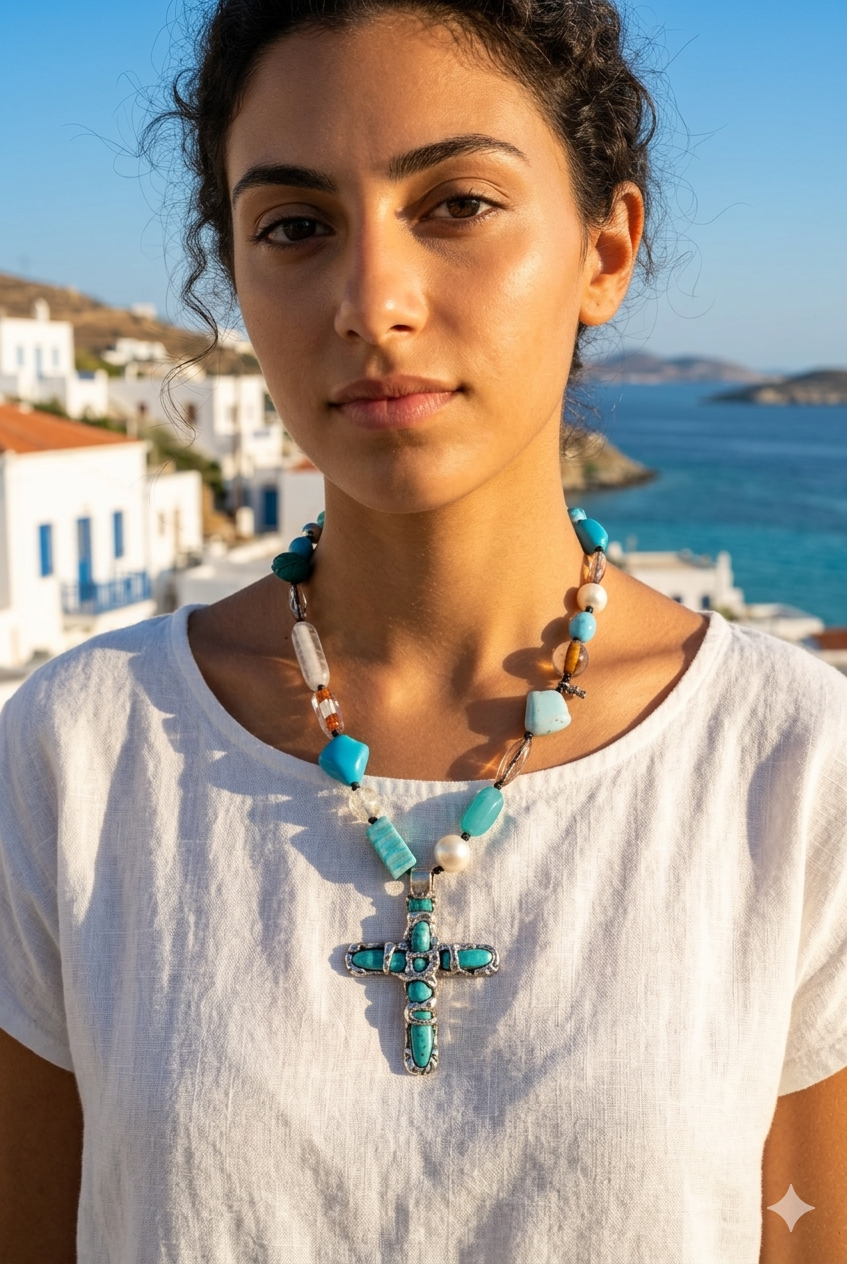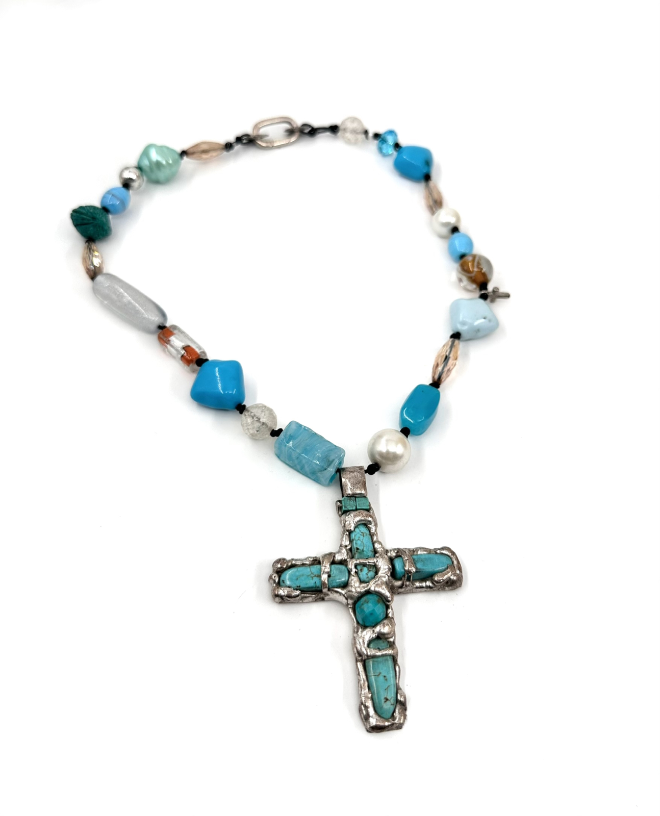 O bijuterie care transcende timpul, aducând un simbol clasic în sfera artei contemporane. Acest colier statement este o celebrare a texturilor organice și a culorilor vibrante. Pandantivul în formă de cruce, modelat manual cu o estetică aproape brută, îmbrățișează bucăți neregulate de turcoaz, creând un contrast fascinant între strălucirea rece a metalului și căldura pietrelor semiprețioase.